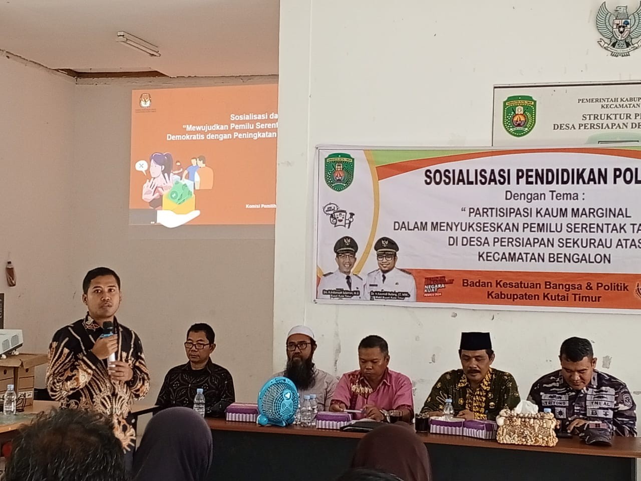#TemanPemilih, Hari ini Sabtu (4/11) Anggota KPU Kabupaten Kutai Timur hadir menjadi narasumber dalam kegiatan Sosialisasi dan Pendidikan Politik "Partisipasi Kaum Marginal dalam Menyukseskan Pemilu Serentak Tahun 2024" yang diselenggarakan oleh Kesbangpol Kutai Timur di Desa Persiapan Sekurau Atas Kecamatan Bengalon. Kegiatan yang berjalan lebih dari 2 (dua) jam tersebut dihadiri oleh kurang lebih 80 (delapan puluh) peserta yang didominasi oleh masyarakat desa setempat. Pada kesempatan itu Anggota KPU Kabupaten Kutai Timur Handoko menyampaikan pentingnya partisipasi pemilih dalam setiap penyelenggaraan pemilihan umum. "Tingginya partisipasi masyarakat dalam menggunakan hak pilih menjadi tolok ukur keberhasilan pemilu." Kata Handoko Handoko juga mengatakan partisipasi pemilih di Kecamatan Bengalon pada setiap tahapan pemilu masih di bawah target nasional. "Tingkat partisipasi pemilih pada pemilu terakhir di 11 (sebelas) desa di Kecamatan Bengalon jika dirata-rata berada di kisaran angka 50an persen. Itu artinya masih jauh di bawah target nasional, yakni 75% pada Pemilu Tahun 2019. Terlebih target partisipasi pemilih pada pemilu 2024 79,5%." Lanjut Handoko Handoko pun berharap angka partisipasi pemilih pada pemilu 2024 bisa mencapai target, seiring masifnya sosialisasi dan pendidikan politik yang diselenggarakan KPU dan dengan dukungan pemerintah. "Harapannya angka partisipasi pemilih pada pemilu 14 Februari 2024 mendatang dapat mencapai target, tentu dengan masifnya sosialisasi dan dukungan pemerintah. Sehingga, tingginya angka partisipasi berbanding lurus dengan kualitas demokrasi." Tutup Handoko Hadir dalam kegiatan tersebut Sekretaris Kesbangpol Kutai Timur beserta jajaran, Bawaslu Kutai Timur, Perwakilan Camat Bengalon, Danposlanal Bengalon, PPK Bengalon, Panwascam Bengalon, Pj. Desa Persiapan Sekurau Atas, PPS Desa Sekerat, PKD Desa Sekerat, dan Tokoh Masyarakat setempat. #KPUMelayani #PemiluSerentak2024 #KPUKutim